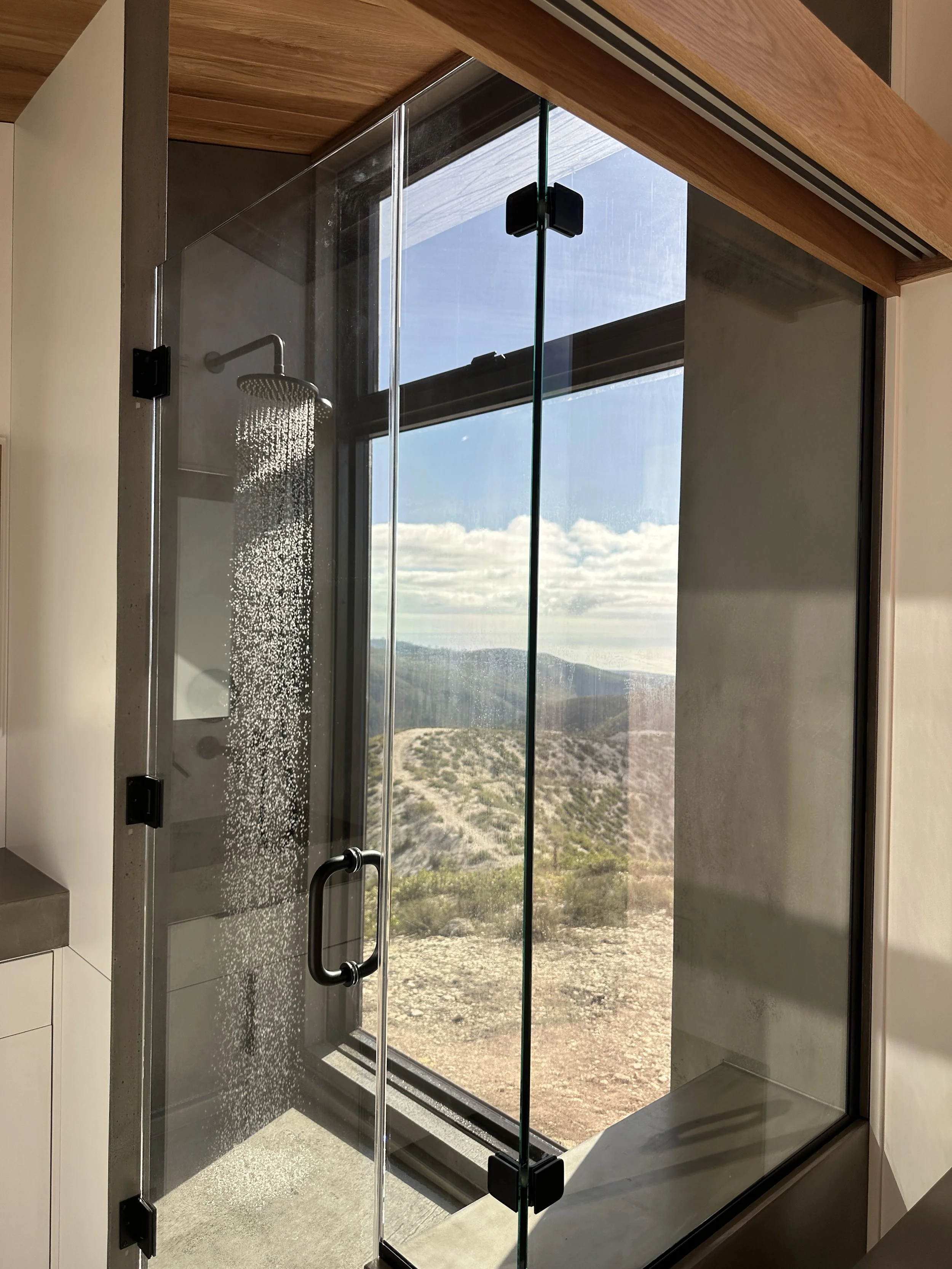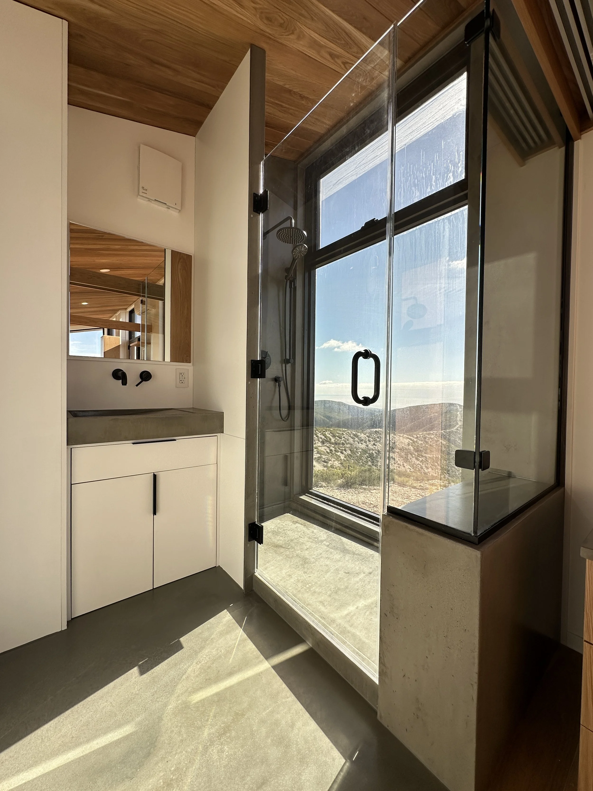 The bathroom has an elegant walk-in glass shower, surrounded by windows, for a remote mountain spa experience.