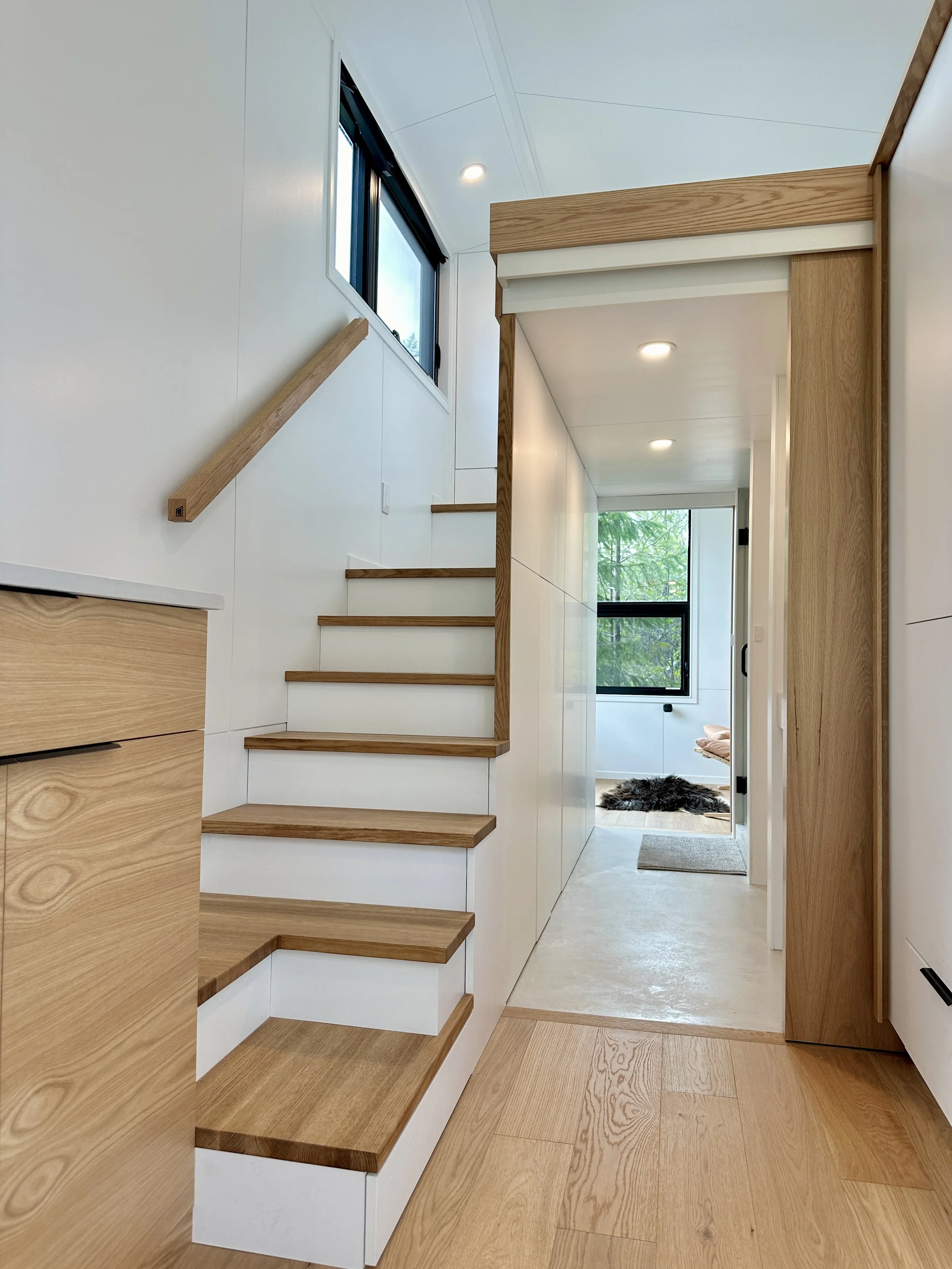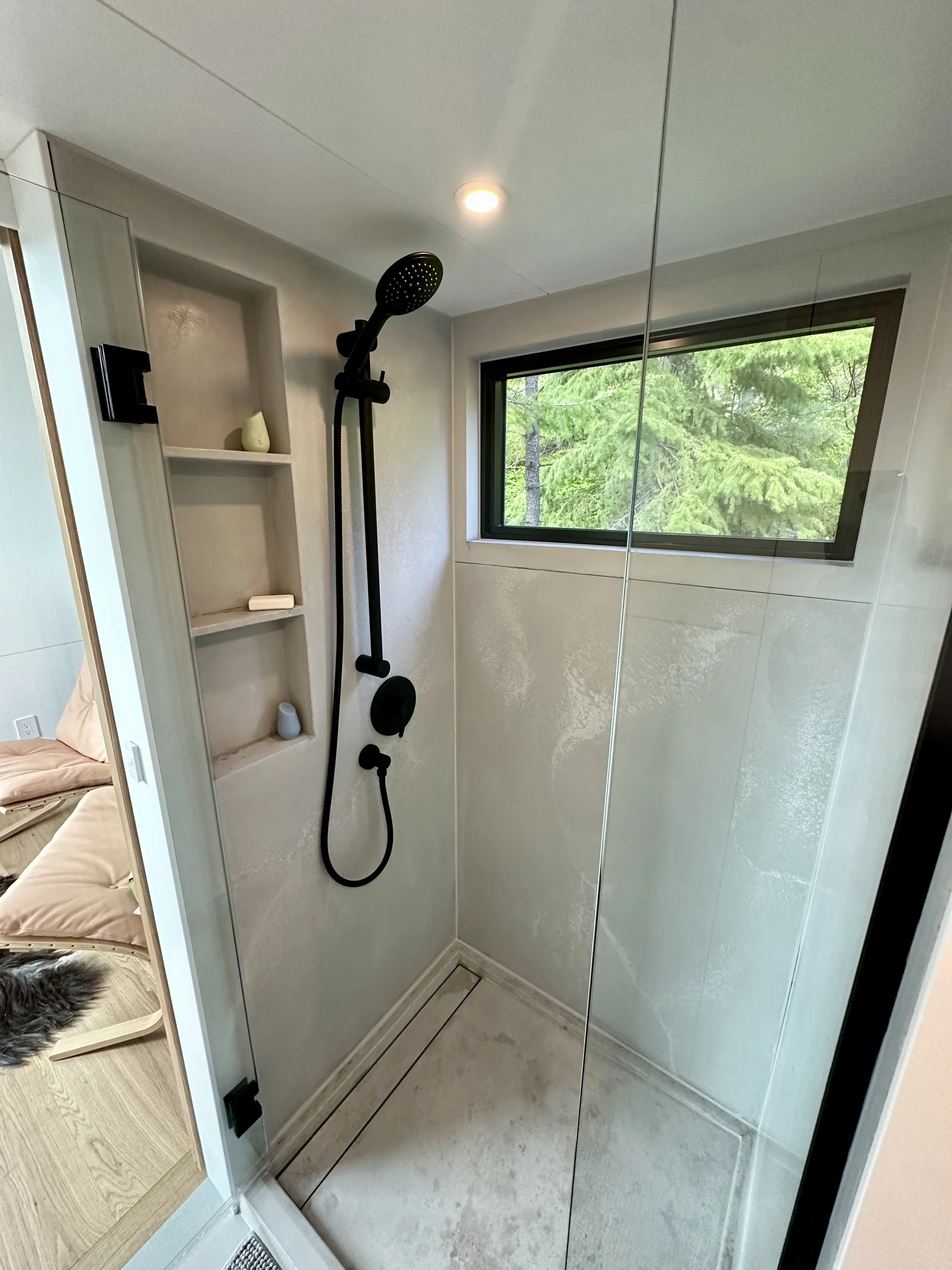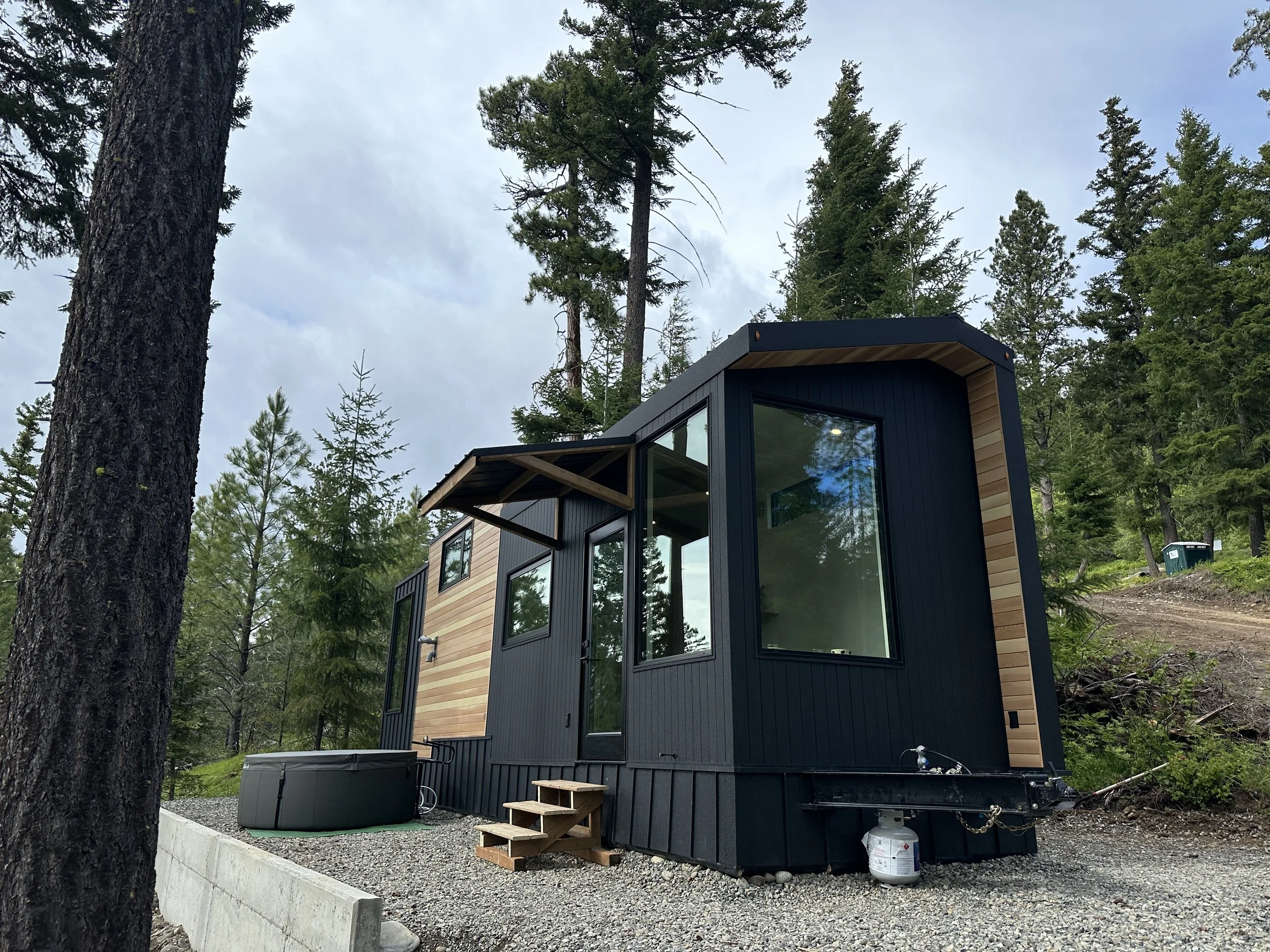 There were some unique challenges our clients faced in deciding where to place their tiny home. If you know anything about tiny homes, you know that finding a parking spot can be tricky due to bylaws and zoning. Every community approaches tiny homes on wheels differently. In this area of Washington, if they wanted to place a permanent cabin on the land, they would be required to pave a significant road. But if the home was movable (certified RV), they did not have to pave or incur this cost. This is where a tiny house on wheels was a perfect solution! Upon deliver, we fully skirted it, so you would never know there are wheels on it, but this allowed our clients to put the house exactly where they wanted it to be without the monstrous additional requirements and costs of paving. Time and time again we are learning…where there’s a will, there’s a way! Sometimes we just have to be creative and reimagine what’s possible.
