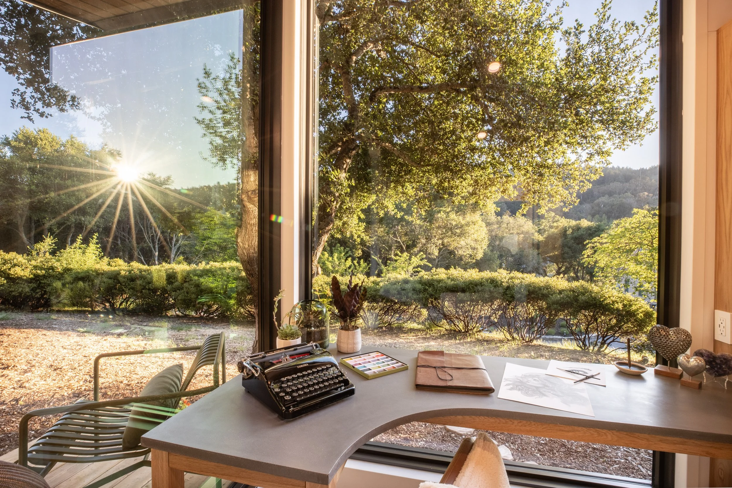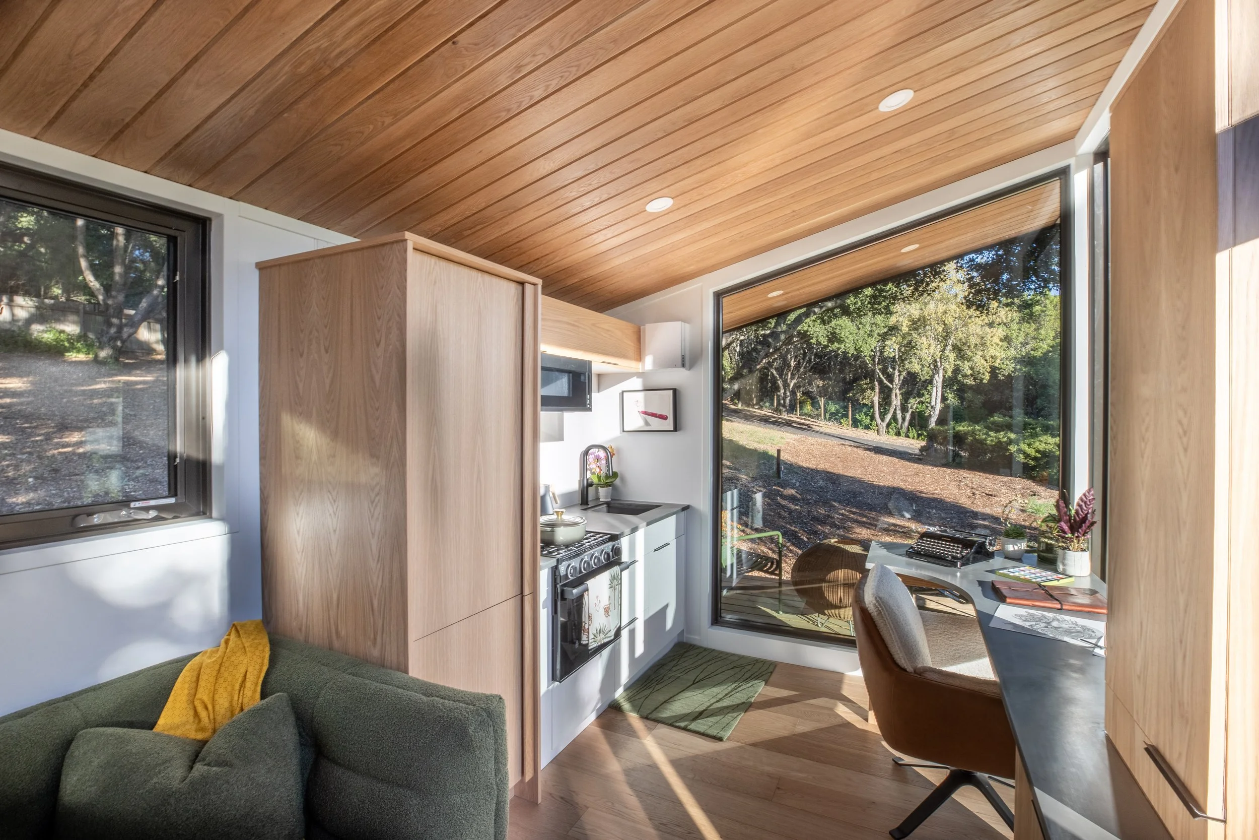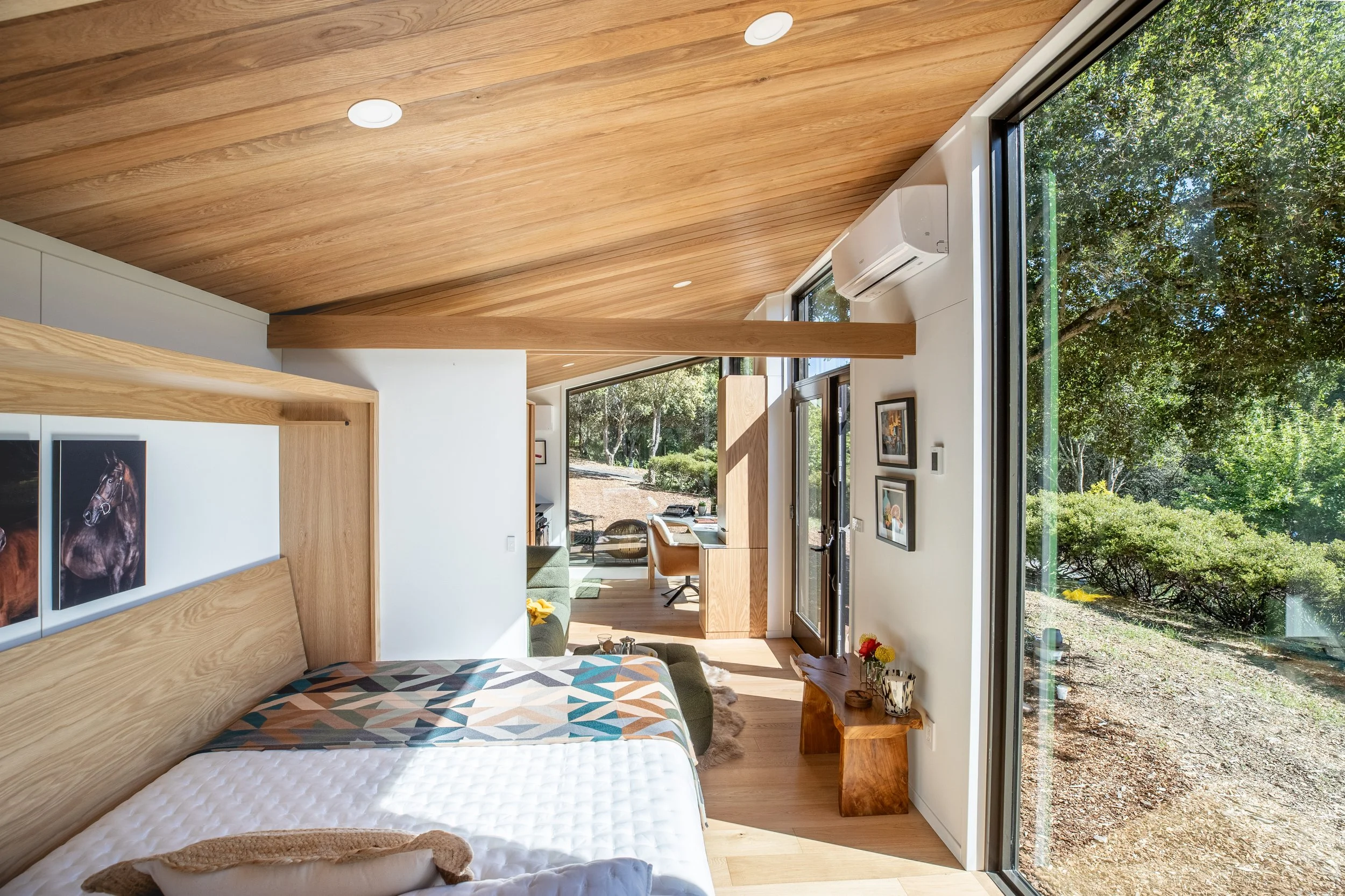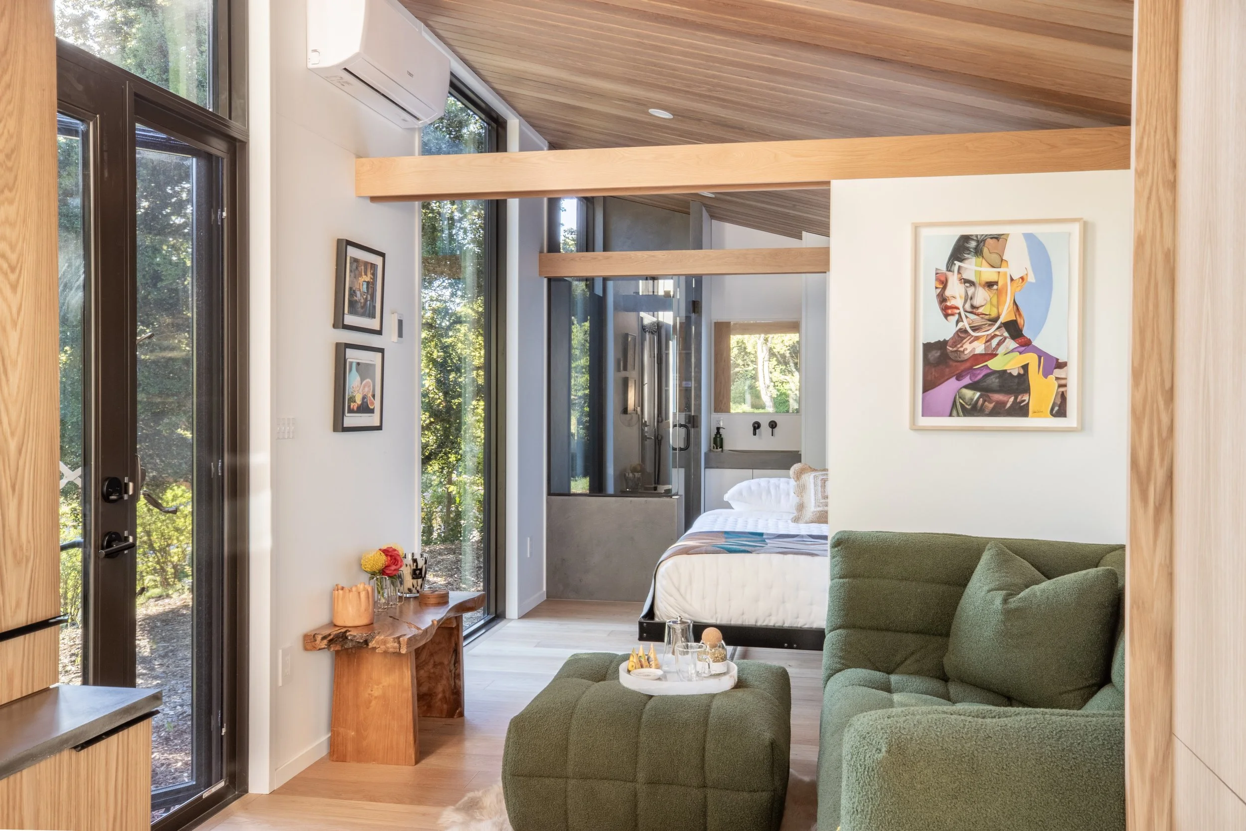 Our incredible client in Palo Alto showed us how the Halcyon Stay can be used as an Accessory Dwelling – a space she was added to her property to escape to, create in, and focus on personal wellness in. We personalized this first Halcyon Stay in some pretty extraordinary ways, to make this a space our client could be inspired in. Our client is an artist, and was looking for a space where she could reconnect to herself, find inspiration for her art, and live a life focused on creativity and movement. We modified the standard custom concrete table to work well as an artist’s desk. We added specific storage for art supplies. And she opted to remove the standard set up – a queen bed with an enormous amount of storage – for a Murphy bed that folds away creating space for a pilates studio and Reformer. She personalized a jaw-dropping luxury bathroom design with a full glass walk in shower and custom concrete vanity. She truly has a tiny home that feels inspired and spacious.