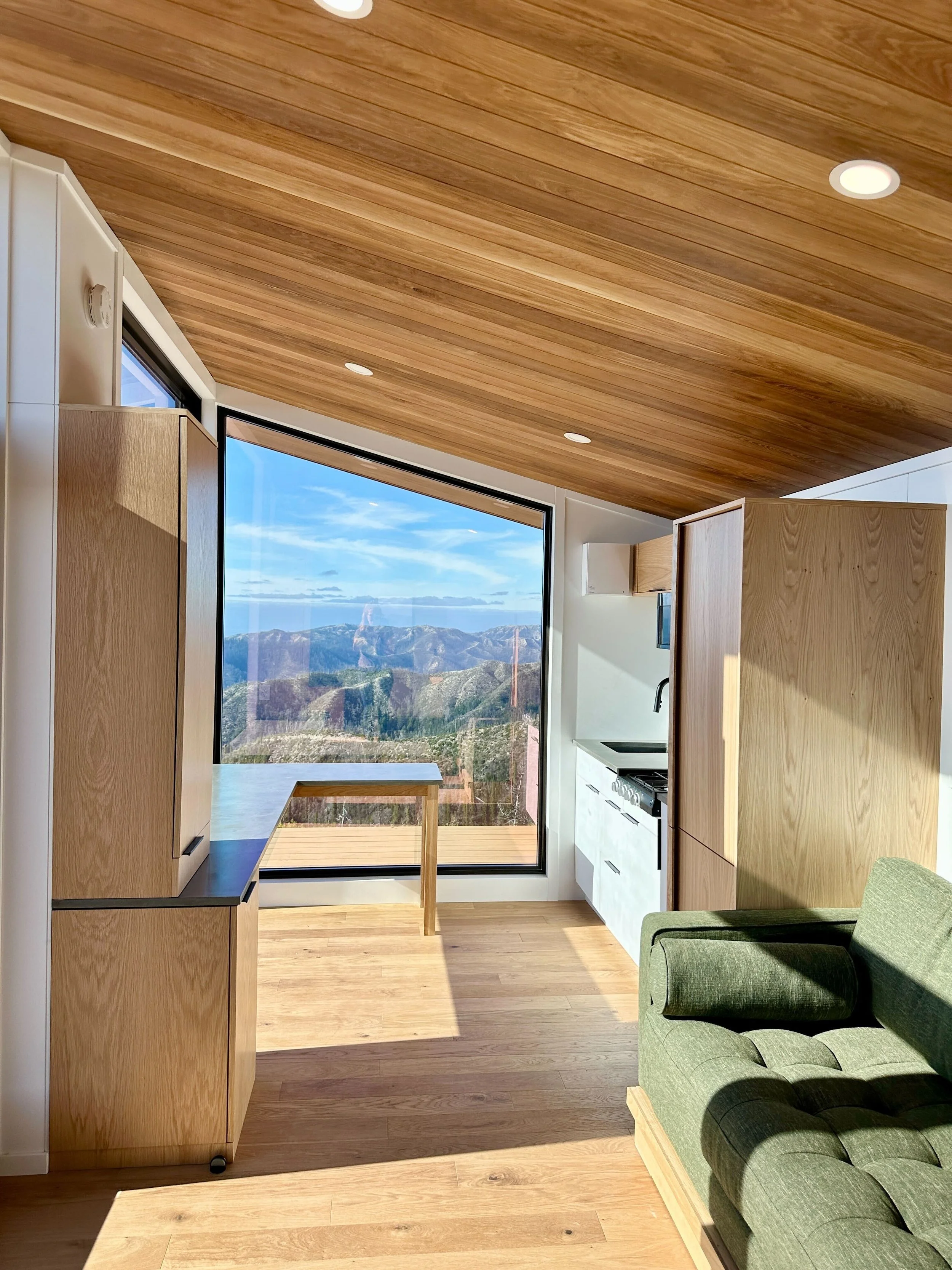 I will never forget watching our tiny home crest a rugged mountaintop. This project meant so much to us for many reasons. It proved that we can truly place homes where our clients dream of living. We hired an off-road towing company to haul the home inch by inch to the site. It was the most challenging install to date, and now we can proudly say we have an off-grid tiny home perched on a mountaintop overlooking the ocean in California.