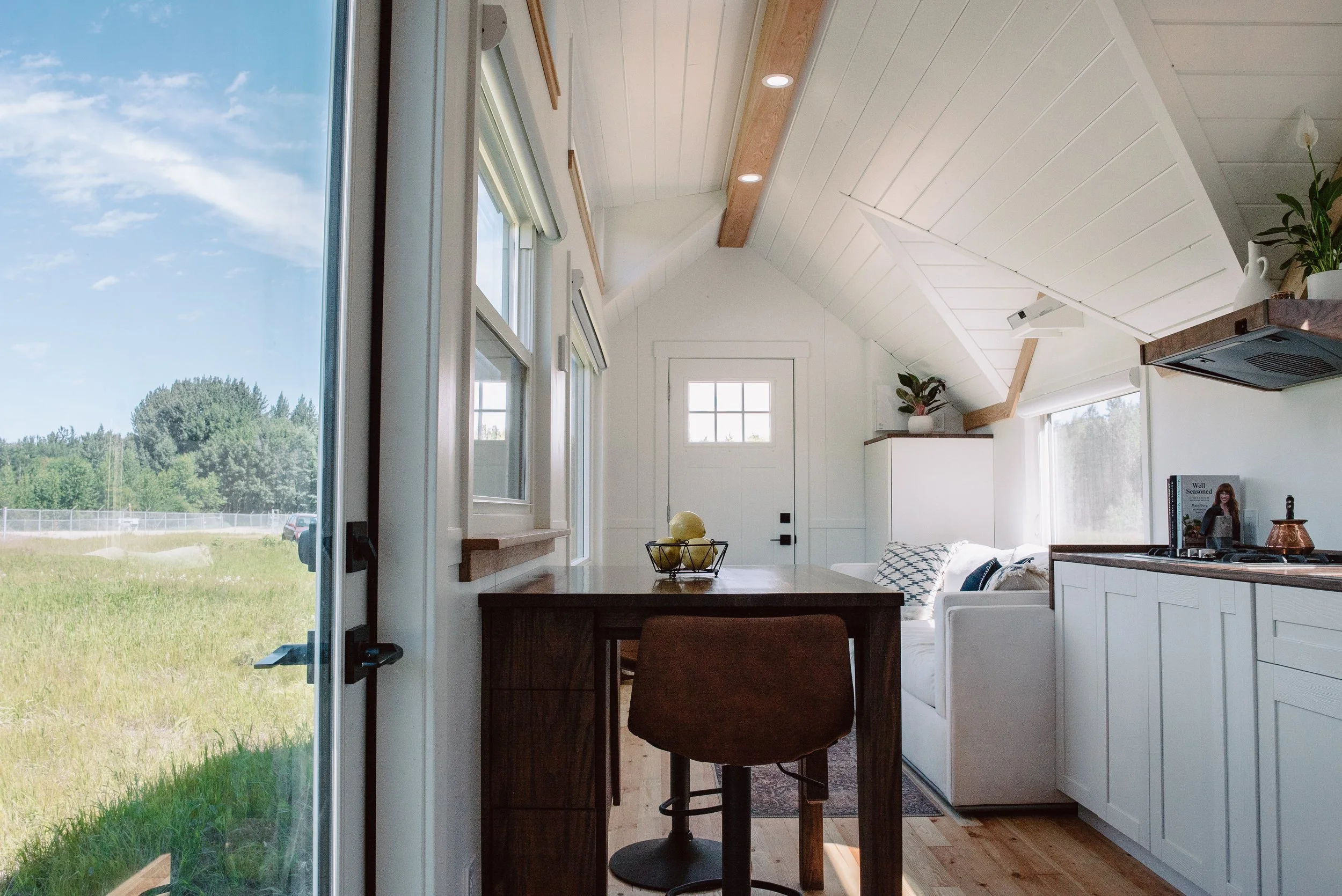 This tiny home was completely designed around the life of our clients. Blending craftsman, eclectic and modern styles, this home showcases fir timber work, intricate rooflines, walnut counters and custom concrete work. Key features include a beautiful living room, full kitchen, luxury bathroom with a soaker tub, full standing height master bedroom with home office, custom furniture, and built-in sound and projector system.